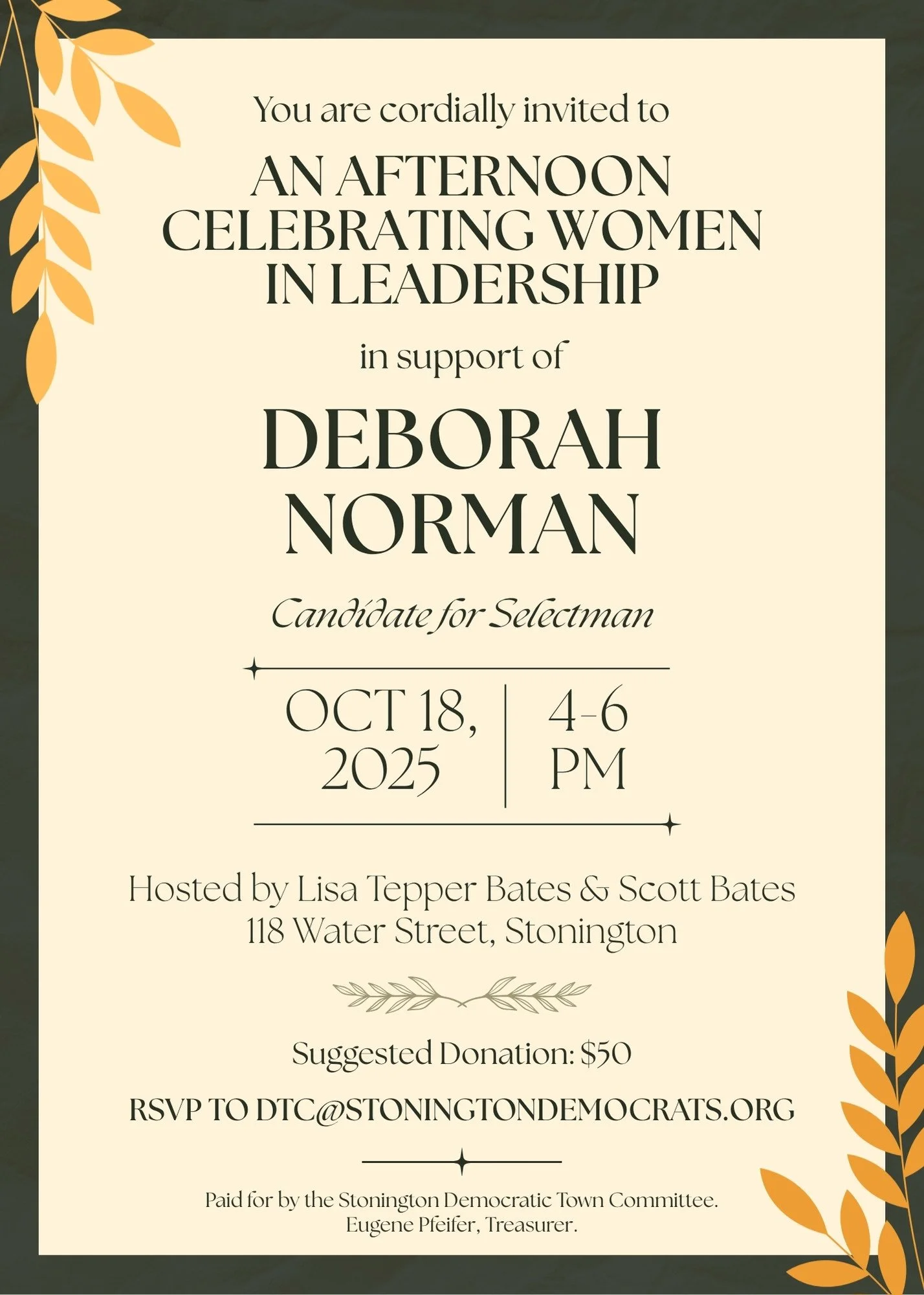 Join the Stonington Democrats for an afternoon celebrating women in leadership in support of Deborah Norman, candidate for Selectman.
